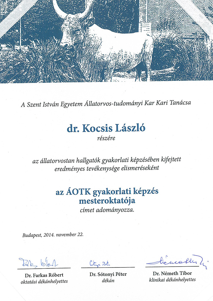 A Szent István Egyetem Állatorvos-tudományi Kar Kari Tanácsa két kollégánk, Dr. Kocsis László és Dr. Csorba Csaba részére az állatorvostan hallgatók gyakorlati képzésében kifejtett eredményes tevékenysége elismeréseként az ÁOTK gyakorlati képzés mesteroktatója címet adományozta 2014. novemberében Budapesten.