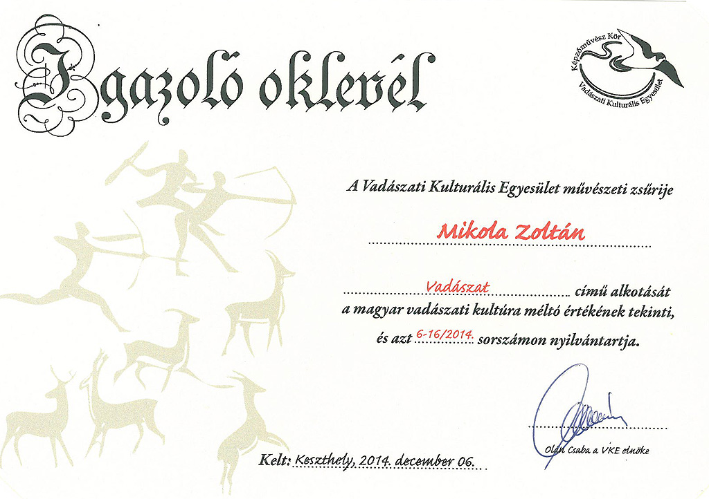 Mikola Zoltán kollégánk hírneve és vadászfotós szakmai munkája újabb trófeával bővült, immáron harmadik fotóját, a VADÁSZAT című alkotását választották be a magyar vadászati kultúra sorszámozott és nyilvántartott vadászati kulturális értékei közé. A Vadászati Kulturális Egyesület művészeti zsűrijének oklevelét ünnepélyes kereket között a keszthelyi Vadászati Múzeumban adták át december 6.-án, ahol Mikola Zoltán további 4 fotóját is kiállításra érdemesnek ítélte a szakmai zsűri.