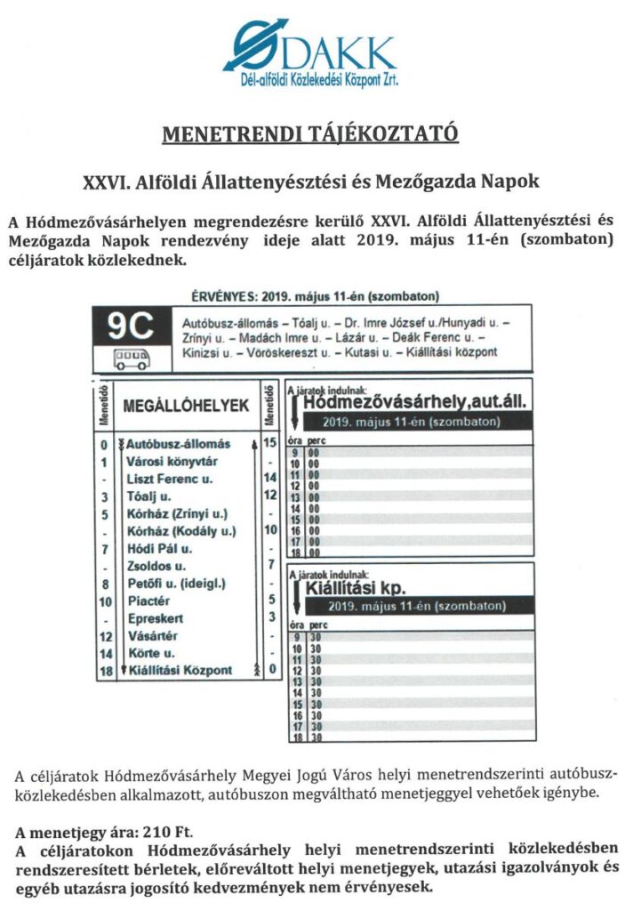 Autóbusz céljárat 2019.május 11-én, szombaton közlekedik a Kiállítási területre és vissza a rendezvény ideje alatt Hódmezővásárhely, autóbusz-állomás megállóhelyről a rendezvény helyszínére (Kiállítási Központ) 9:00 órától 18:00 óráig, a rendezvény helyszínéről (Kiállítási Központ) Hódmezővásárhely, autóbusz-állomás megállóhelyre 9:30 órától 18:30 óráig 60 percenként indul, azaz minden óra egészkor autóbusz-állomásról indul kiállítási területre, vissza a kiállításról minden óra 30 perckor.