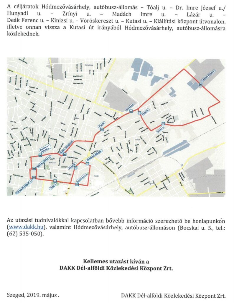 A Tramtrain építkezés miatti ÚJ útvonal: Hódmezővásárhely, autóbusz-állomás- Tóalj u.- Dr. Imre József u./Hunyadi u.- Zrínyi u.- Madách Imre u.- Lázár u.- Deák F. u.- Kinizsi u.- Vöröskereszt u.- Kutasi u.- Kiállítási központ, illetve onnan vissza a Kutasi út irányából Hódmezővásárhely, autóbusz-állomás.